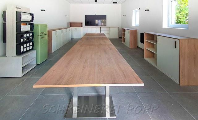 Auch der Bereich der Team- und Kundenkommunikation wird bei Schreinerei Popp großgeschrieben: Der imposante Konferenztisch ist mehr als nur ein Möbelstück – er ist der zentrale Treffpunkt in jedem Konferenzraum, der Entscheidungsprozesse erleichtert und Gespräche inspiriert. Ebenso bringt der praktische Besprechungstisch frischen Wind in kleinere Besprechungsecken und schafft eine Atmosphäre, in der kreativer Austausch und produktive Diskussionen florieren können.
